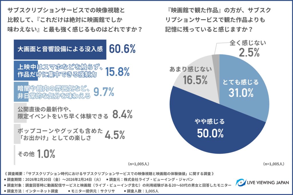 いつでも手軽に観られるサブスクが定着する一方で、映画館で観た作品の方が記憶に残っていると「とても感じる」「やや感じる」と回答した方が約8割に上りました。