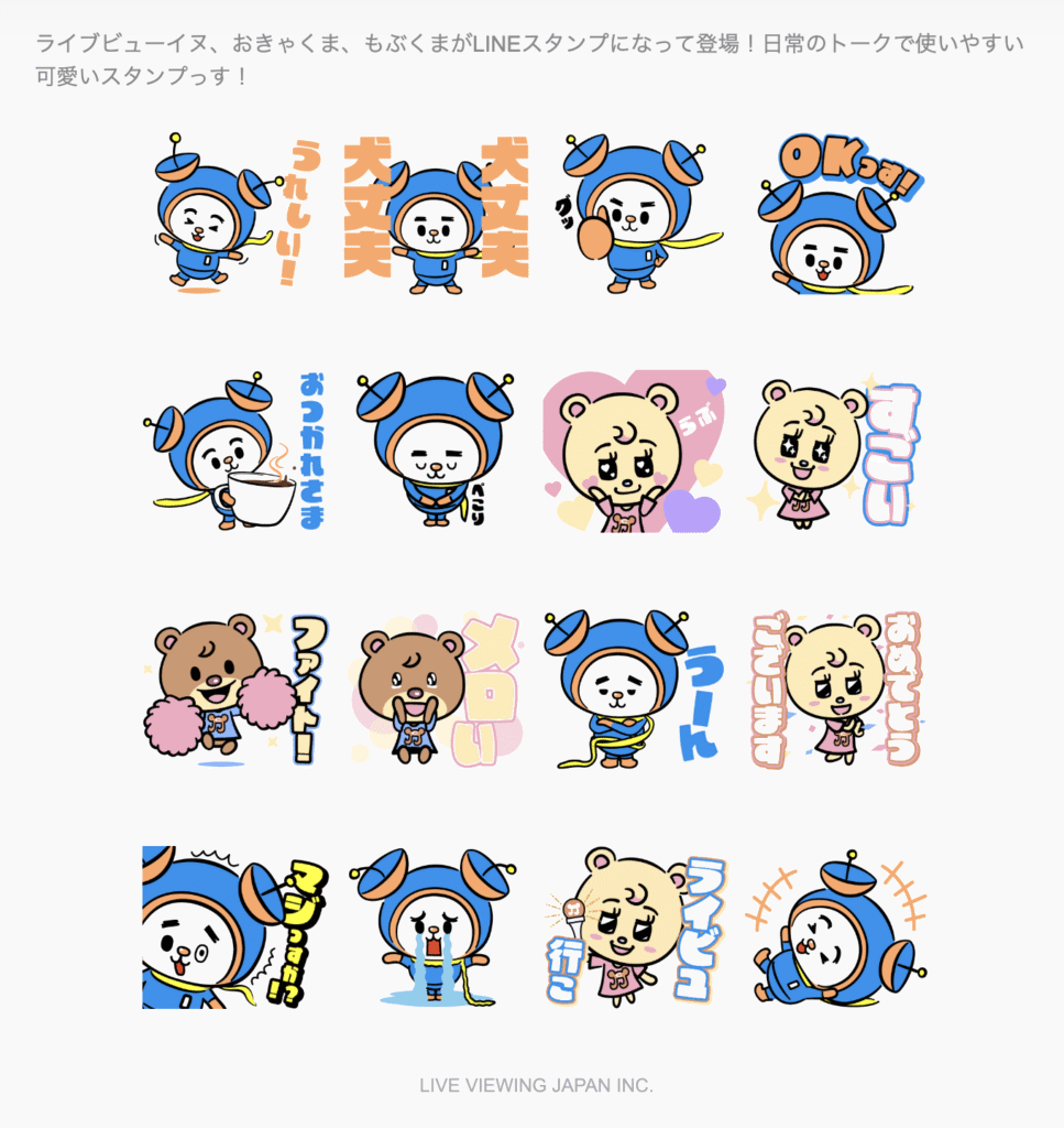 当社は、はうつーライビュ動画に出演していたライブビューイヌ、おきゃくま、ザセキーイヌ、スクリーイヌ、もぶくまを、ライブ・ビューイング・ジャパン公式キャラクターに決定いたしました。